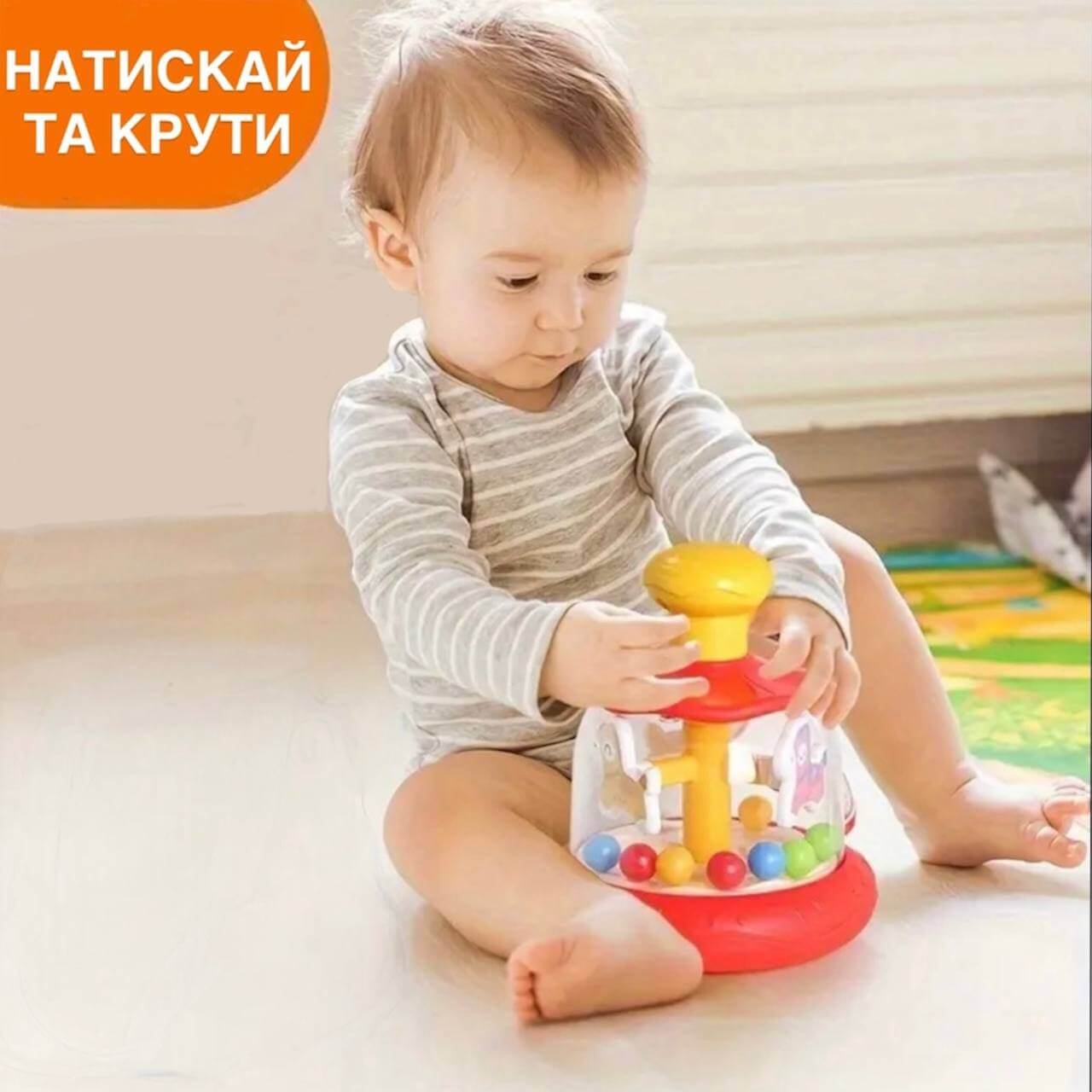 Завдяки глянцевій прозорій купольній конструкції дитина чудово бачить, як обертаються фігурки, що стимулює зорове сприйняття, концентрацію та координацію рухів.