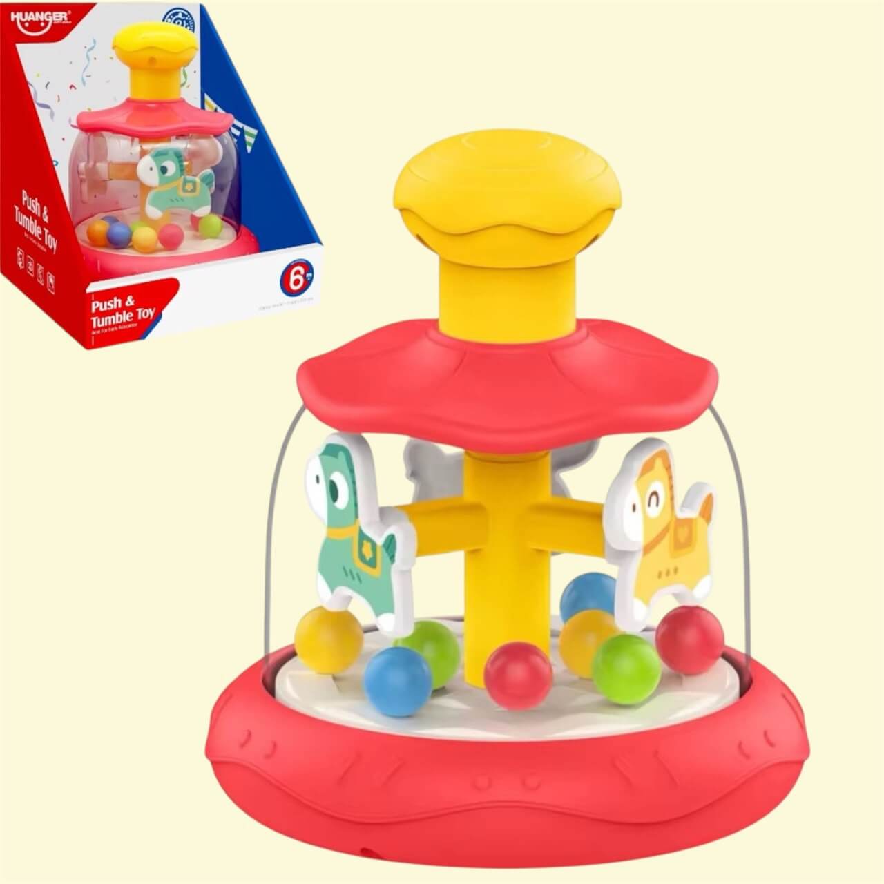 Іграшка-карусель — це яскравий та цікавий розвивальний атракціон для малюків від 6 місяців. Достатньо натиснути на верхню кнопку — і карусель весело закрутиться, приводячи у рух милих поні всередині.