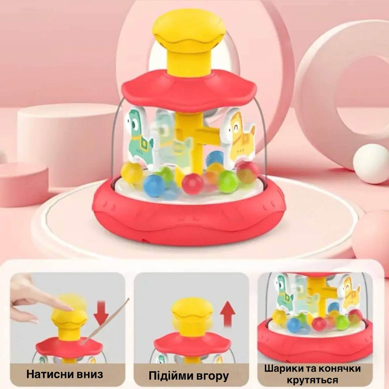 Іграшка дзиґа з кульками Конячки (червона), дитяча розвиваюча іграшка-карусль