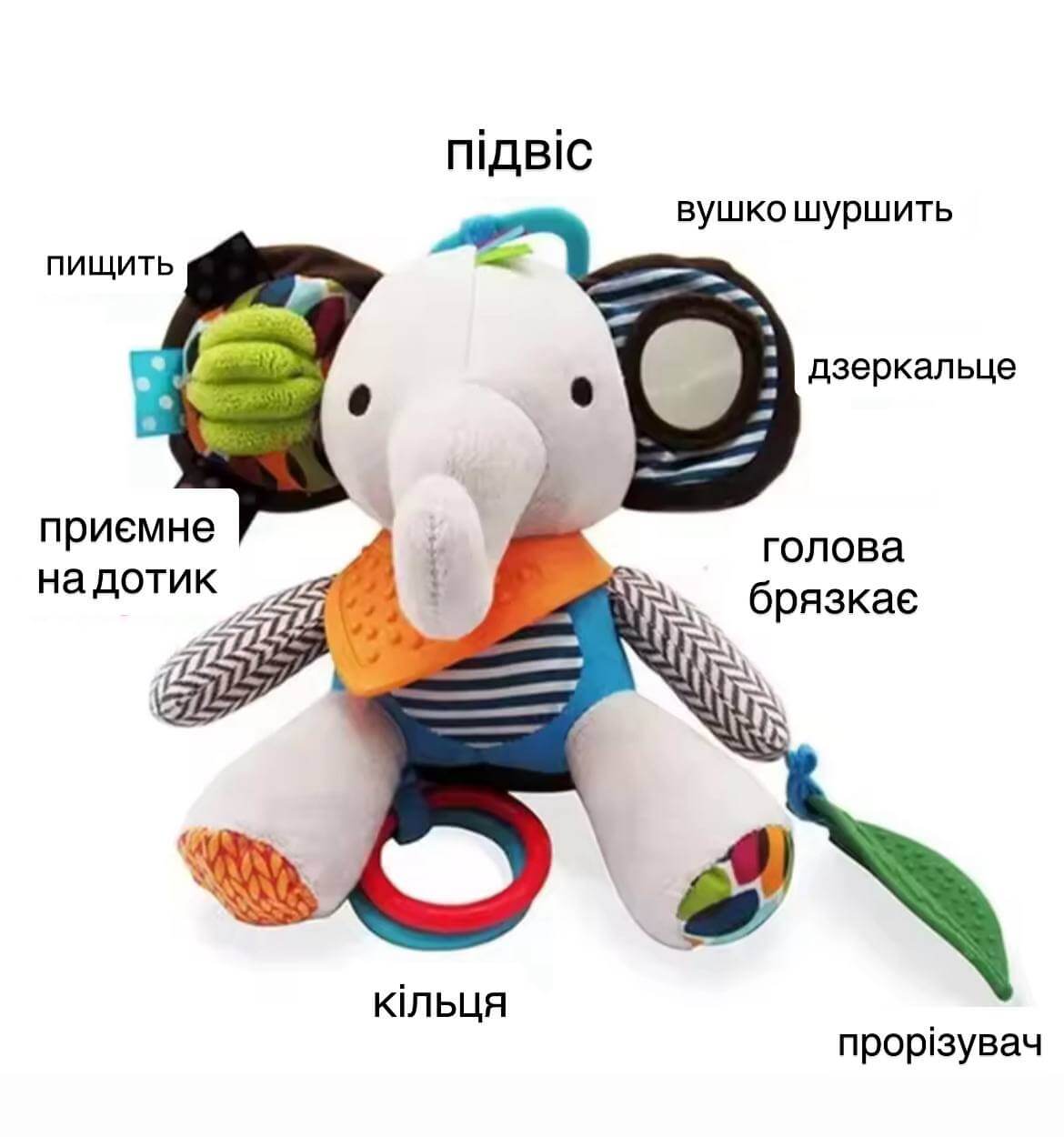 Іграшка яскрава, безпечна, виготовлена з якісних матеріалів і стане улюбленим другом вашого малюка під час прогулянок і вдома. Ідеально підходить як перша розвивальна підвіска!