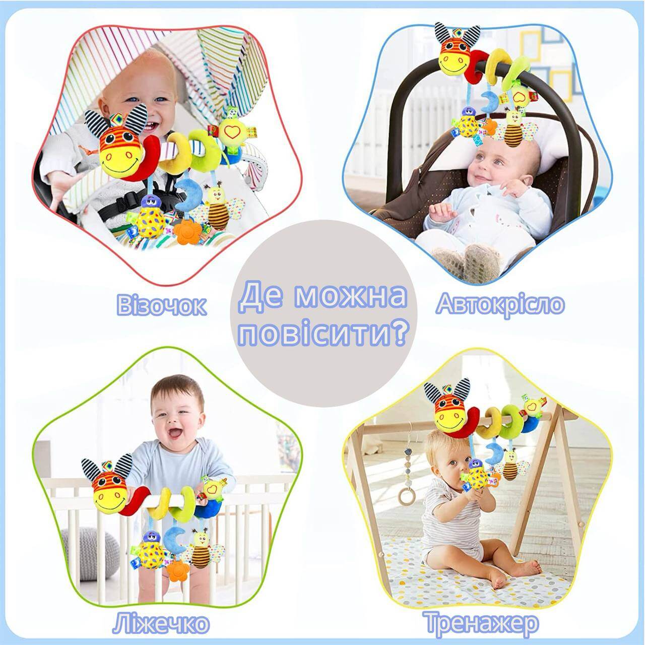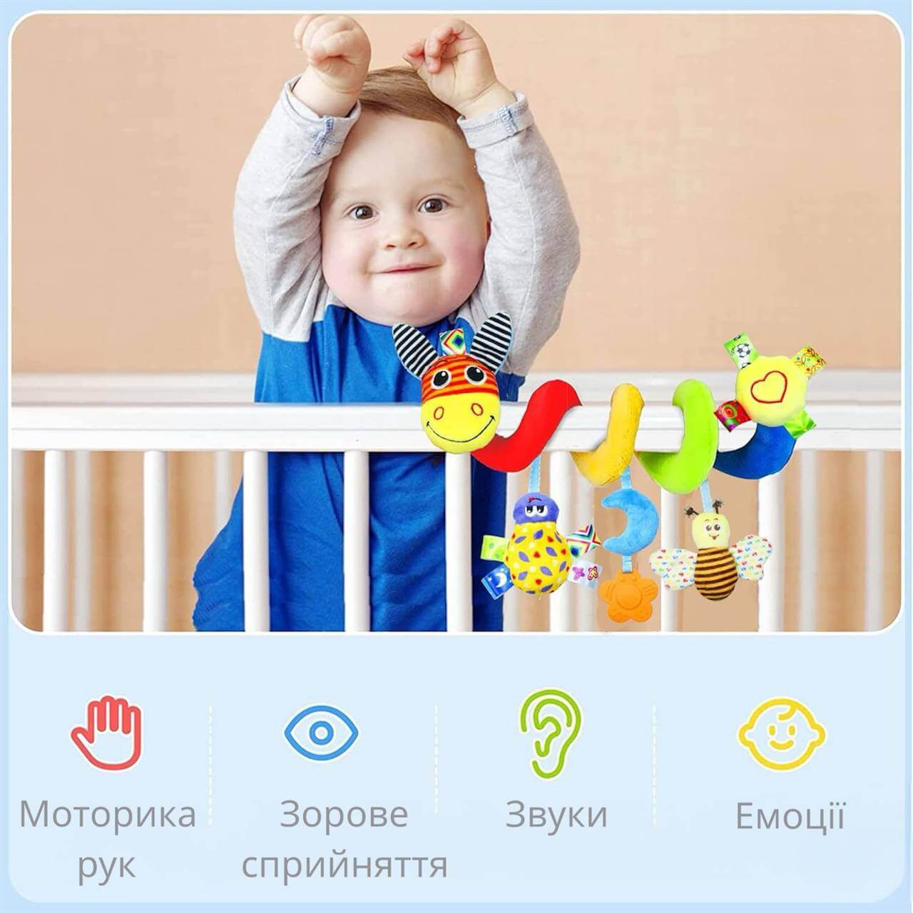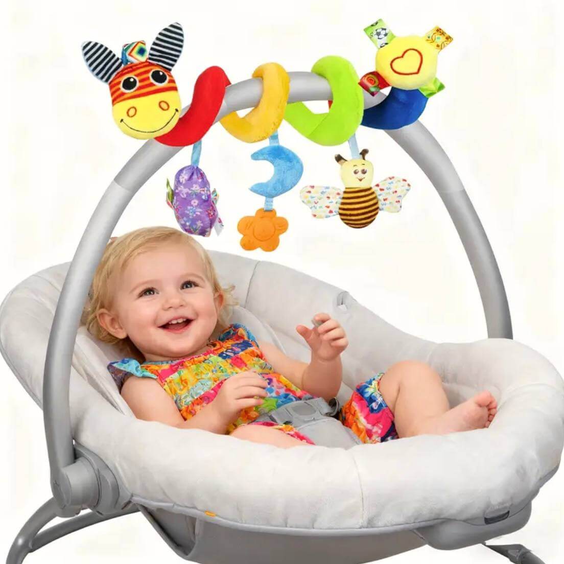 Яскрава та м’яка спіралька — це іграшка, що подарує малюкові безліч емоцій та водночас сприятиме розвитку з перших місяців життя. Вона легко кріпиться на дугу розвивального килимка, коляску, автокрісло чи ліжечко, обвиваючись навколо ручки або бортика, та надійно тримається під час гри.