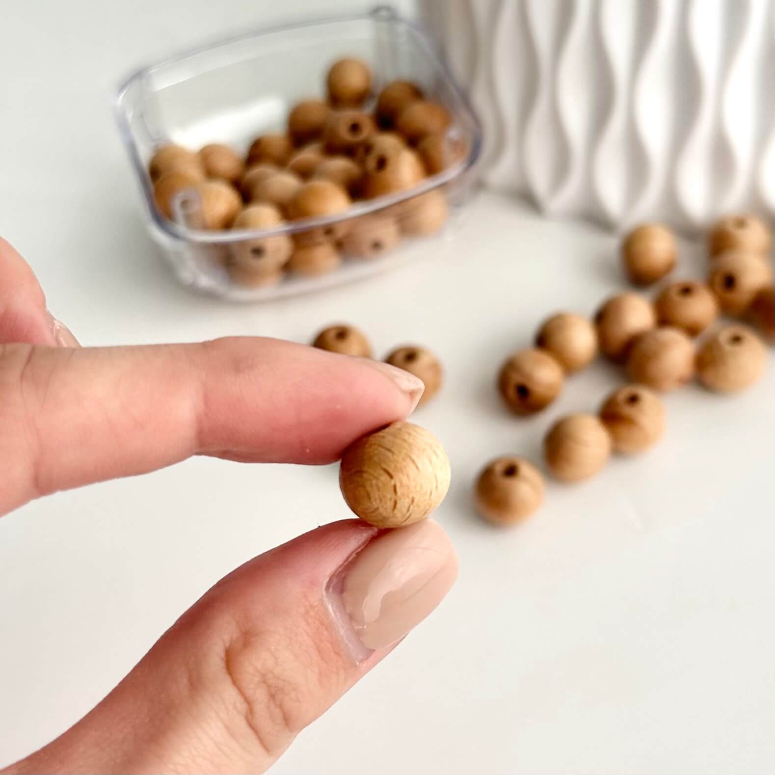 Деревяная бусина (порода бук) форма круглая 10мм . Одна из основных бусин для изготовления держателей для соски или именных грызунков.