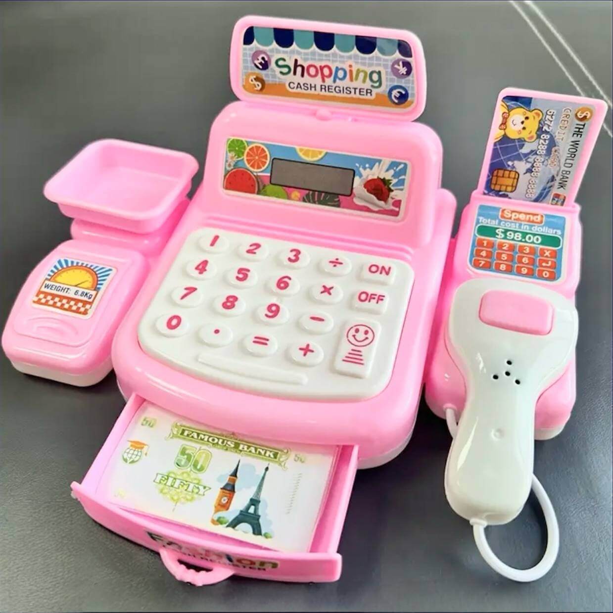 Ребенок сможет "пробивать" покупки, рассчитываться картой или купюрами, выдавать сдачу и играть в магазин вместе со взрослыми или друзьями.