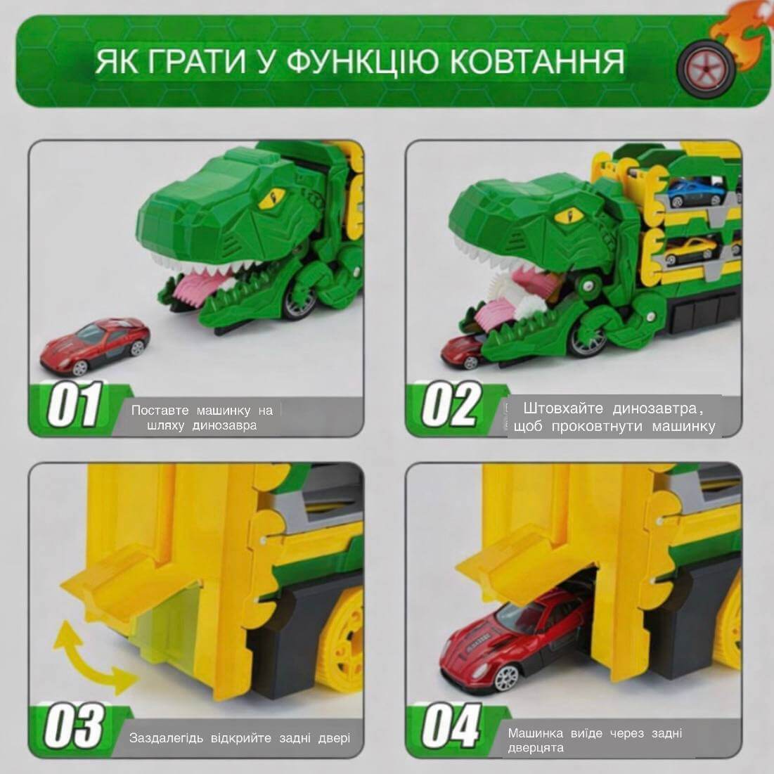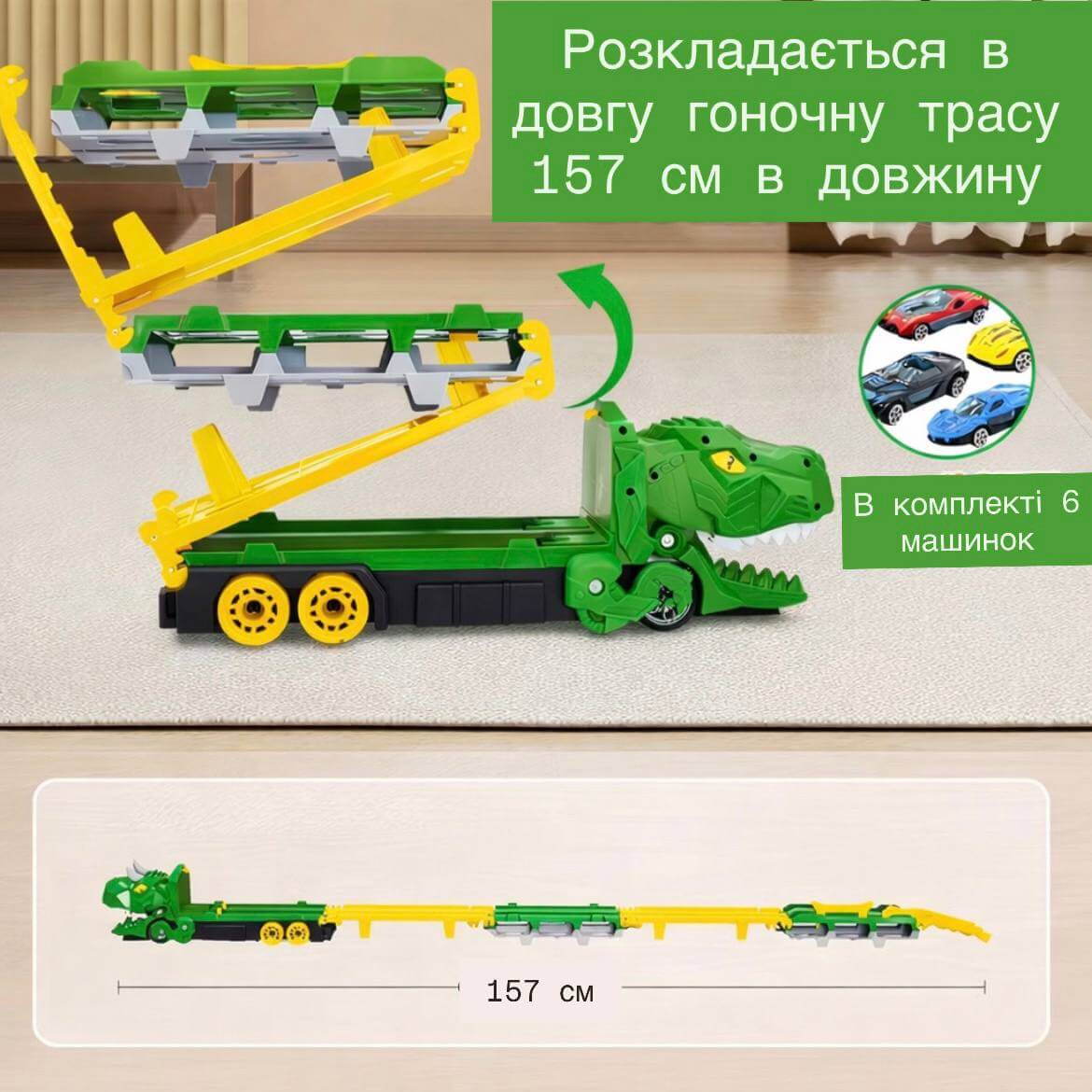 Внутри динозавра расположены многоуровневые отсеки для хранения автомобилей. Дополнительно корпус игрушки раскладывается в длинную трассу, где каждая машинка стартует нажатием кнопки — это делает игру ещё более динамичной и увлекательной.