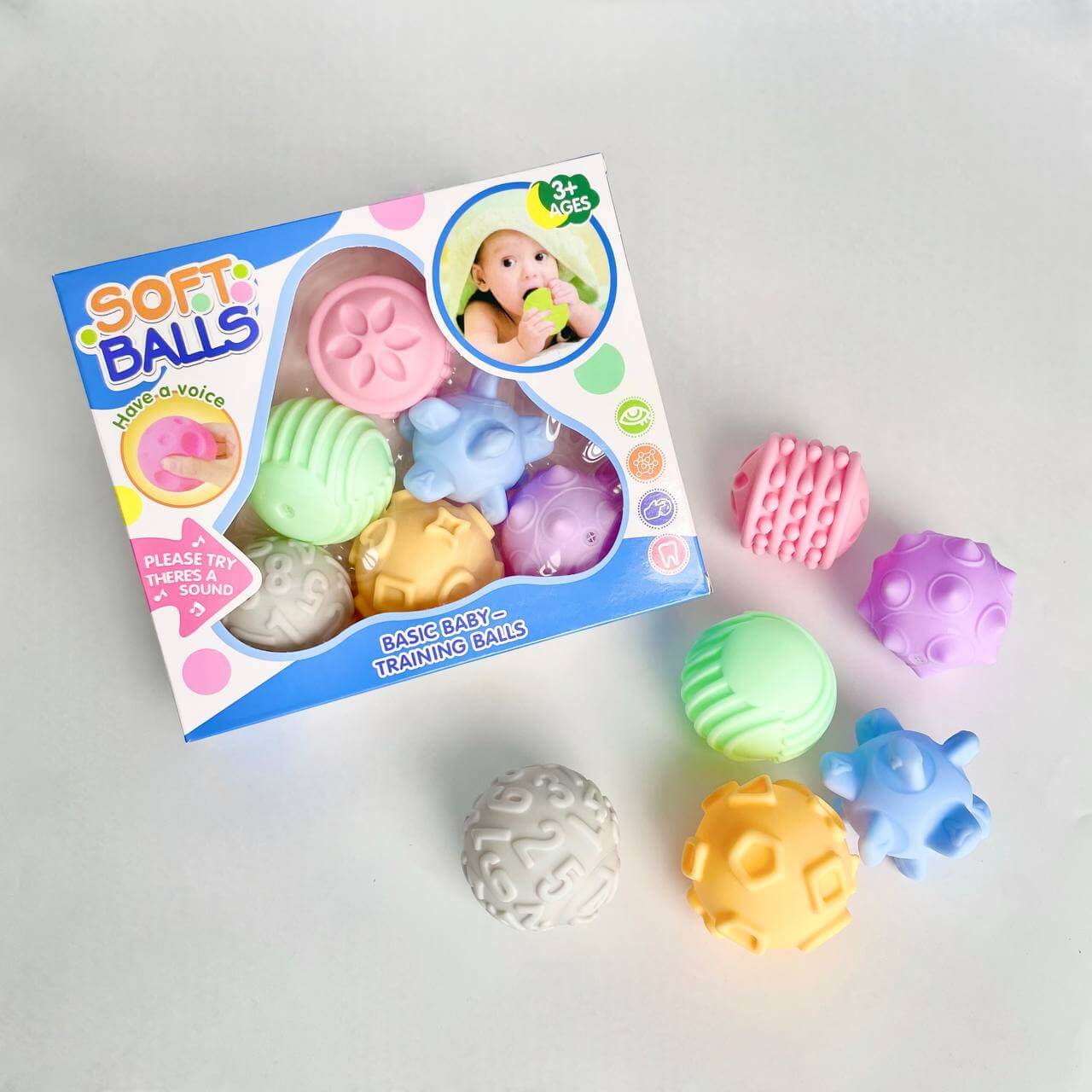 Каждый мячик имеет уникальную текстуру: выступы, ребристые линии, геометрические фигуры и объемные элементы. Это стимулирует тактильные ощущения, развивает мелкую моторику, координацию движений и сенсорное восприятие. Малыш с удовольствием будет исследовать разные поверхности, сжимать и перекатывать мячики.