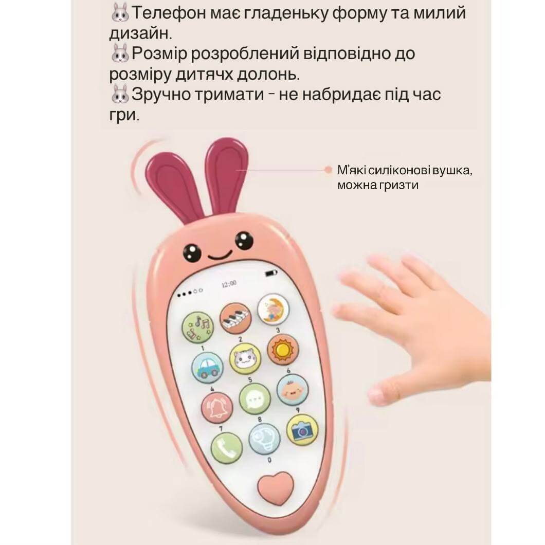 Детский телефон в форме Зайчика – яркая и веселая игрушка для малышей. Воспроизводит разные мелодии, звуки животных и настоящие телефонные сигналы, что делает игру еще более интересной.