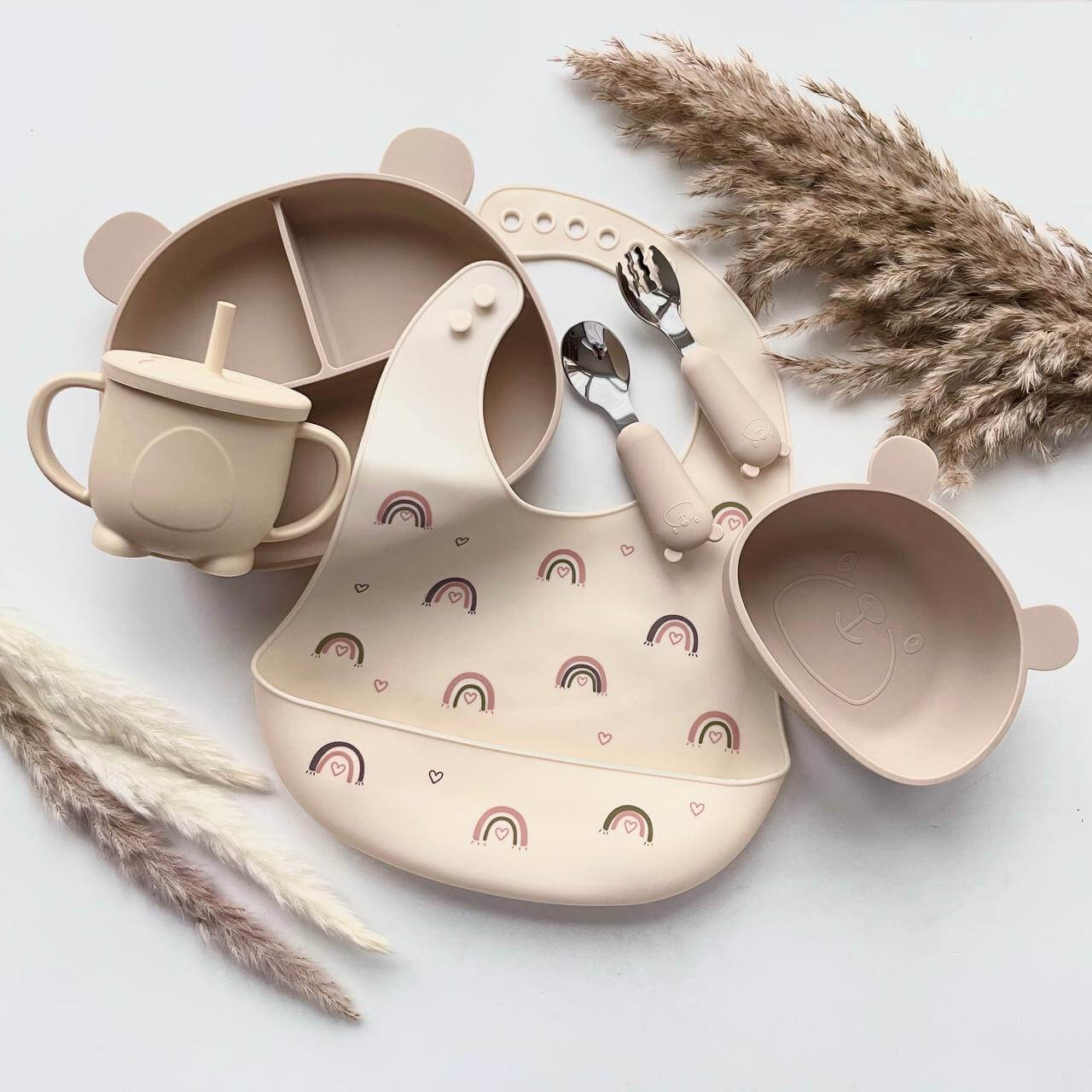 Силіконовий слюнявчик принт Веселка (бежевий)