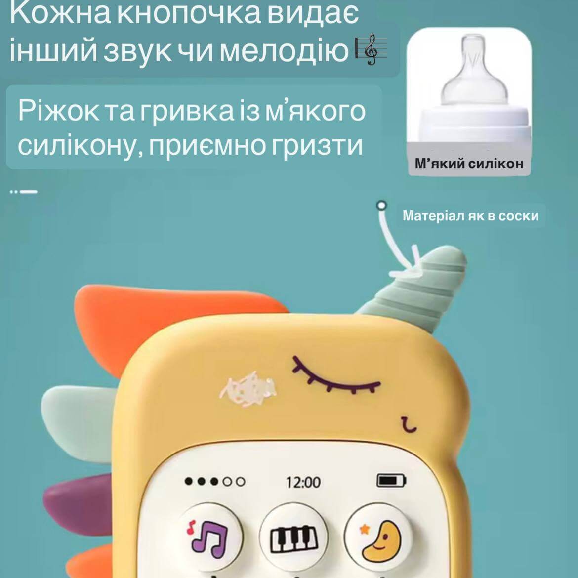Дитячий телефон у формі Єдинорога - яскрава та весела іграшка для малюків. Відтворює різні мелодії, звуки тваринок та справжні телефонні сигнали, що робить гру ще цікавішою.